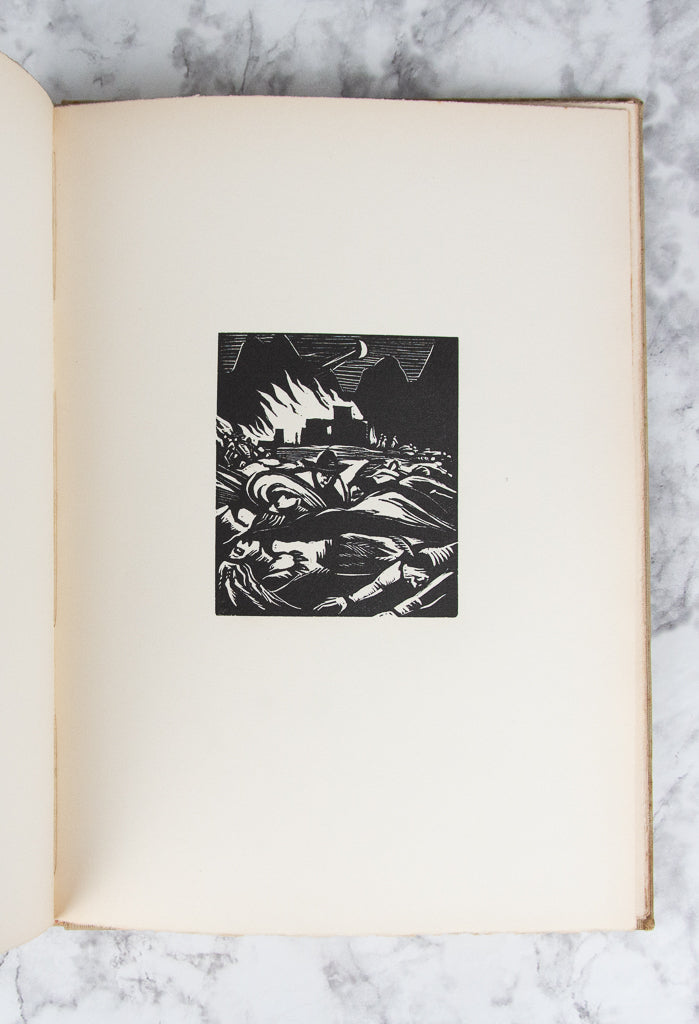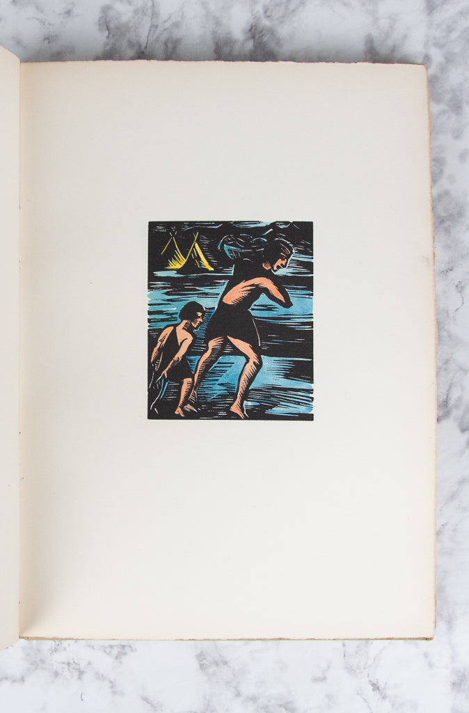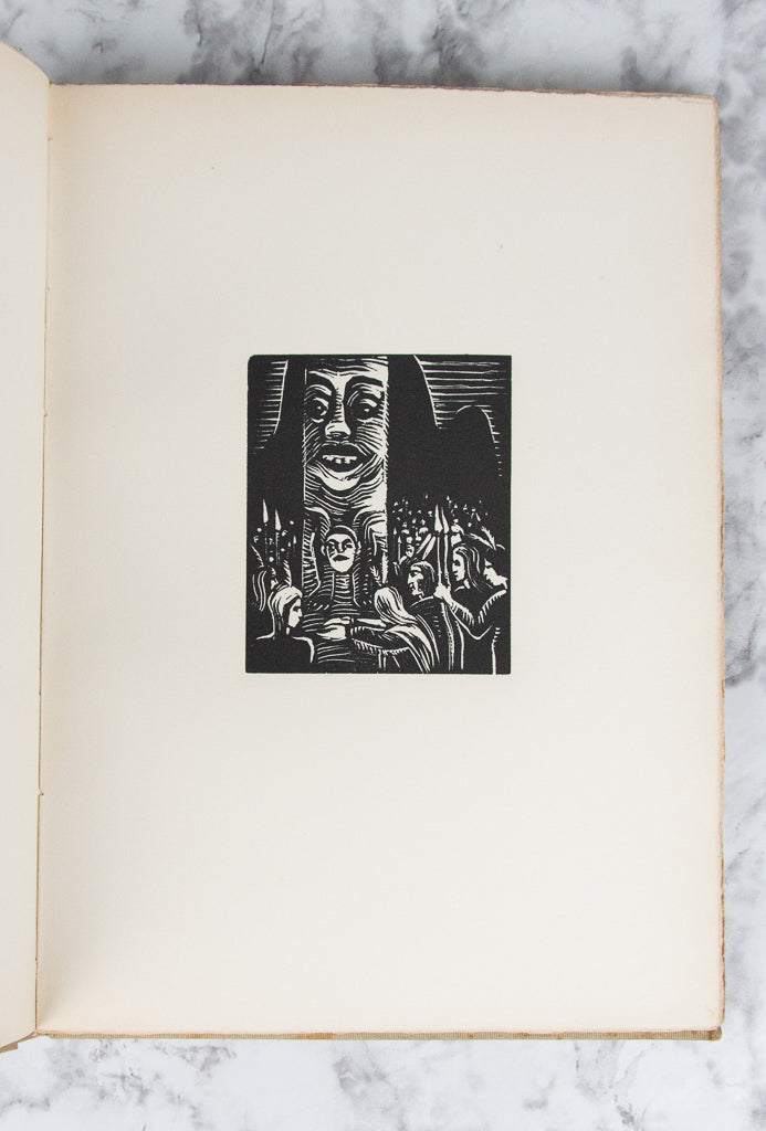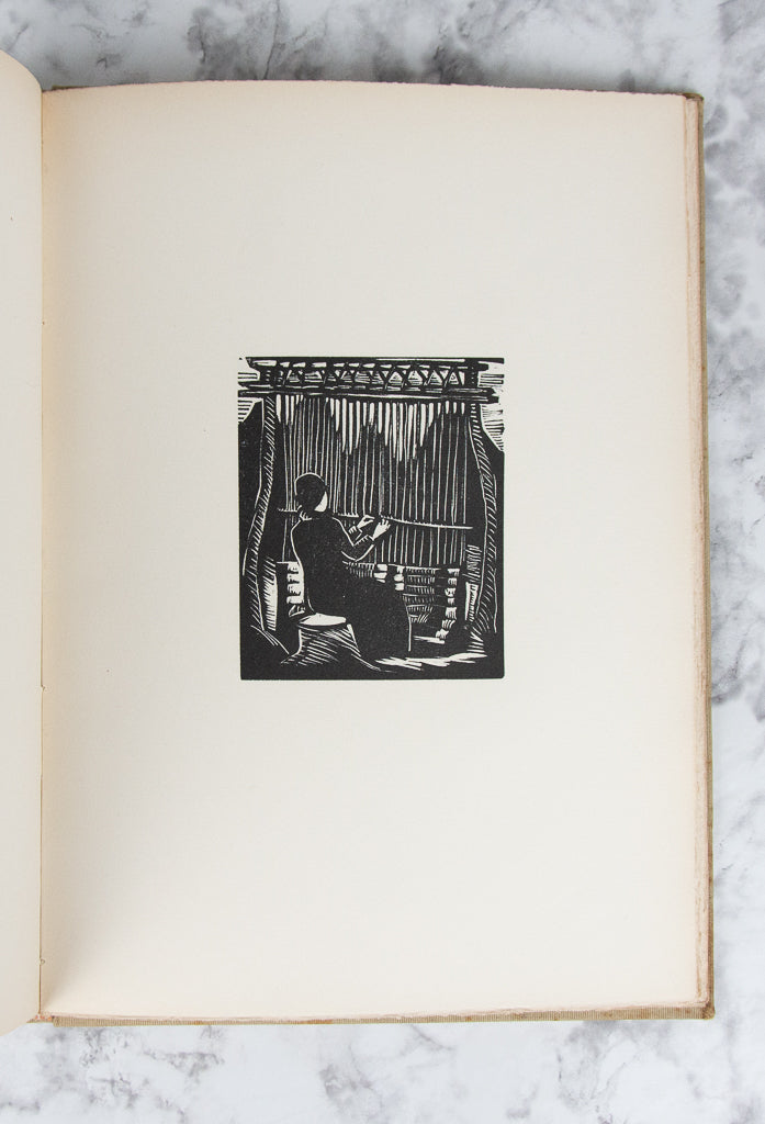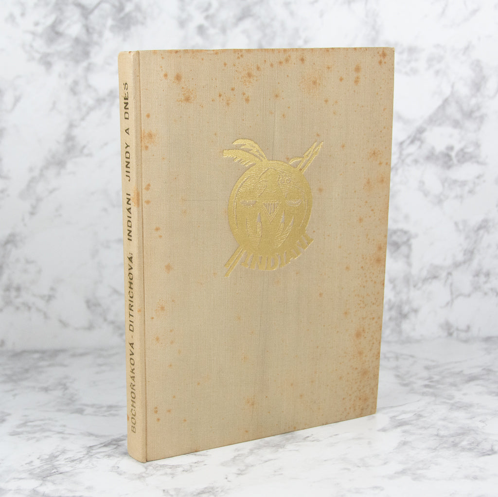 BOCHORAKOVA-DITTRICHOVA, Helena. Indiani Jindy a Dnes. Kniha drevortyu. [Indians Then and Now. A Book of Woodcuts.] (Hranice-Brno: Josefem Hladkým, 1934) [57] leaves. (272 x 195 mm.) First Edition. One of of 125 copies (of which 100 were for sale), this copy unnumbered. Publisher's tan cloth boards, upper cover with gilt stamp, gilt titling on spine. Without the slipcase. With 51 woodcut illustrations, seven of which are hand colored (by a previous owner?). Boards with some foxing, pencil marks, and the cloth slightly sunned; a couple of leaves with very faint thumb soiling, but the contents otherwise pristine.