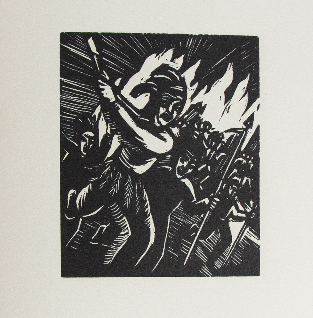 Consisting of 51 woodcut images and a short introductory text by the author, "Indians Then and Now" was inspired by the artist’s journey to the United States in 1931. It presents a brief history of the Odawa and Pueblo peoples from before the arrival of Europeans through the early 20th century. The images commence with idyllic scenes of Native American life, followed by first contact with European settlers. The compositions become increasingly conflict driven, including Pontiac's armed struggles against the British in 1763, and clashes with settlers during the great western expansion. The final images, by contrast, depict the resurgence of traditional arts and culture in Southwestern communities in the late 19th and early 20th centuries. This work is distinct among the wordless novels of Bochořáková-Dittrichová, an artist who favored portrayals of religious subjects, contemporary places and events, and her own life experiences, such as her first work, "Z Mého D tství" ("From My Childhood"). Poignant and expressive, "Indians Then and Now" is a particularly powerful work in the artist's oeuvre--as well as one of the most difficult to obtain.